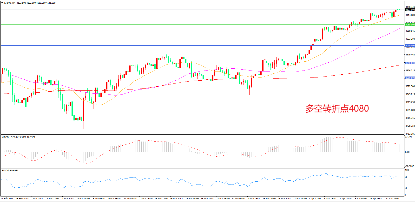 4小时图看,标普500大幅拉升后延续高位震荡,整体表现偏强,下方低点逐步抬高,21周期均线成为短期支撑,MACD红柱减少,RSI指标走平,日内延续震荡概率较大。