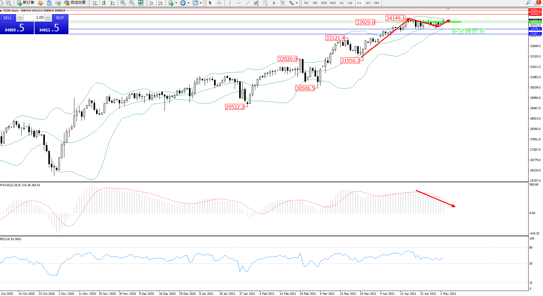 道琼斯指数DJ30—— 日K线图显示: