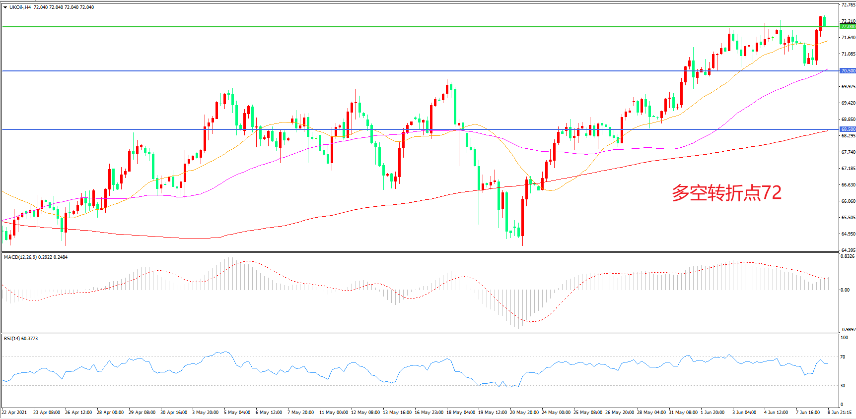 4小时图看,油价延续高位震荡,整体表现偏强,21周期均线成为下方支撑,72美元成为上方阻力,MACD红柱减少,RSI指标走平,日内延续震荡概率较大。