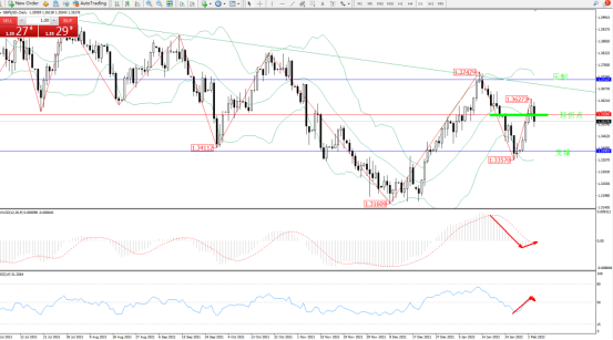 低位多头动力短期急速震荡拉升至1.36273附近遇阻回撤,纠结于布林带指标中轨附近节点巨震,布林带指标呈张口走势后开始收口平移,短期或维持在布林带指标上下轨区间巨震,上方压制关注1.37137附近,低位支撑关注1.33953附近,关注1.35585附近转折点,MACD指标空头动力跌破0轴线进入空头区域后回撤整理,RSI指标处于50均衡线附近维持窄幅震荡中,如图: