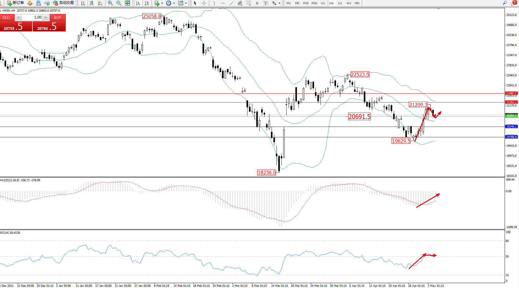 恒指HK50 ——4小时K线图显示: