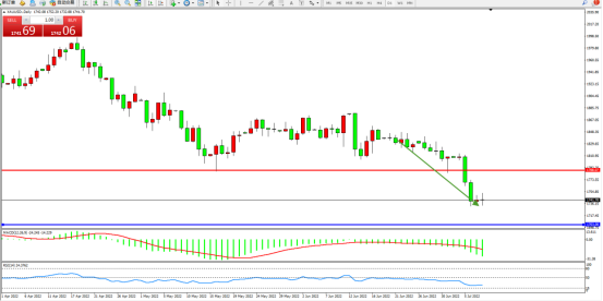 空头动力弱势整理后急速下挫,纠结于1741附近窄幅整理,短期跌势未见有止步迹象,上方压制关注1788附近,低位支撑关注1703附近,MACD指标处于空头区域整理下移,RSI指标处于空头区域低位窄幅整理平移,如图: