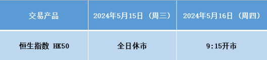 因应2024年5月15日 (周三) 为香港佛诞假期,本公司以下产品的交易时间将于假期期间作以下安排,敬请知悉留意!