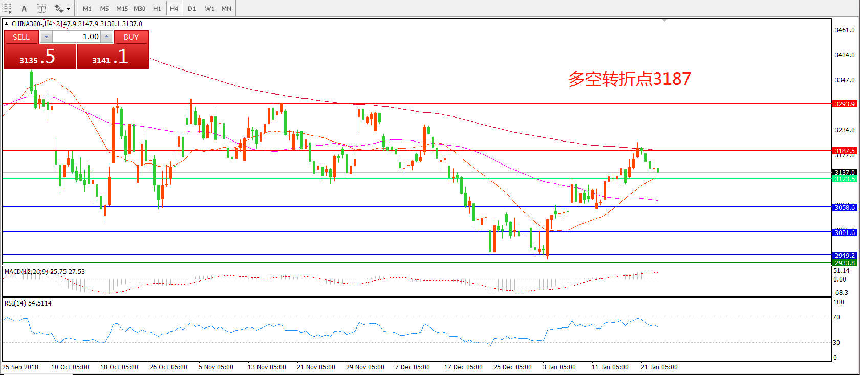 4小时图看,CHINA300中华指数站稳3058后陷入整理,冲击3187.5一线阻力如期回落, MACD红柱增加,短期反弹仍有可能。